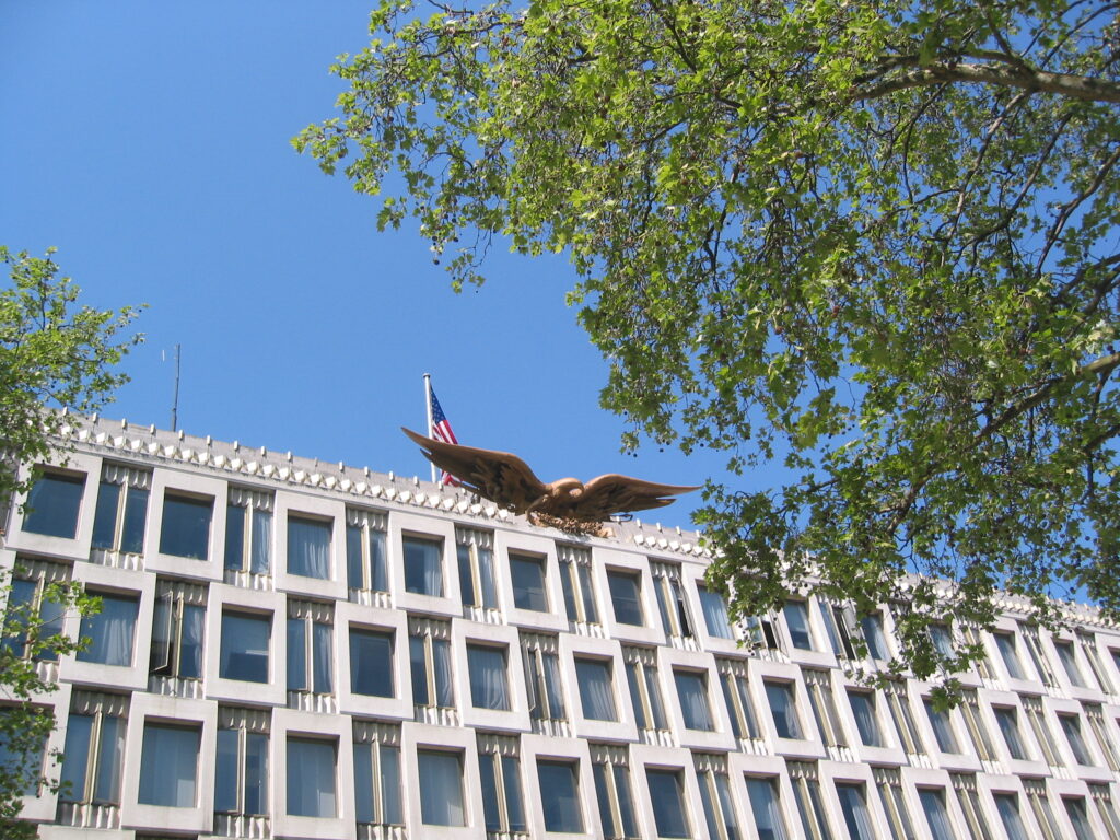 Il futuro albergo super-lusso non è solo l’ennesimo alloggio per Paperoni, come i recenti Peninsula, Great Scotland Yard e Raffles, ma racchiude anche pezzi di Storia: è stato per decenni l’Ambasciata degli Stati Uniti, in uno dei periodi più turbolenti della storia dell’Europa. Il palazzo, unico moderno di tutta la piazza, e sede europea del Generale Heisenower durante la guerra, è stato costruito dall’architetto finnico-americano Eero Saarinen che progettò un edificio di 9 pian, di cui 3 sottoterra per non superare l’altezza degli altri immobili sulla piazza. Sulla facciata, in cima, svetta ancora un’aquila con le ali aperte, larga 10 metri, simbolo del paese. Lì dentro sono passati molti destini del Vecchio Continente degli ultimi 100 anni: per quasi un secolo, dal 1938 fino al 2017, quelle finestre hanno ospitato la sede diplomatica americana.
