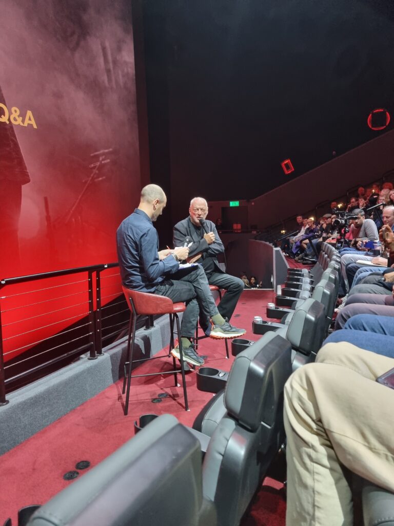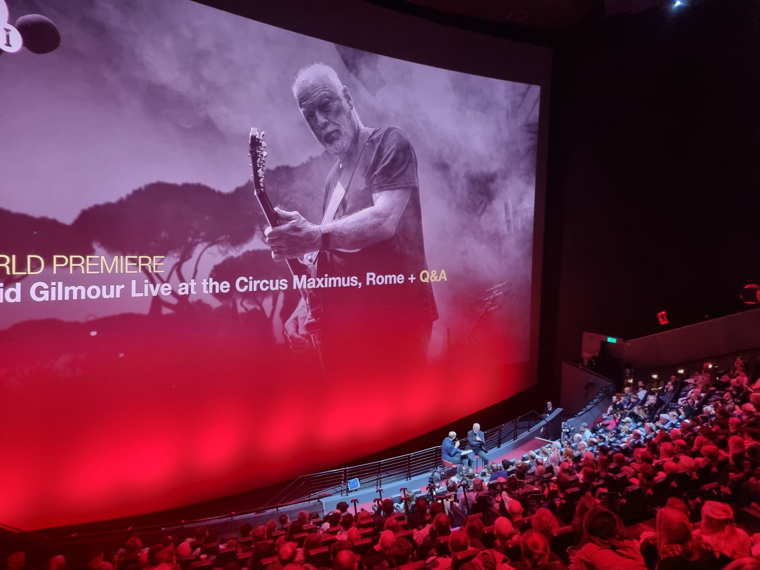 Alla fine della proiezione, Gilmour arrivato fin dal primo pomeriggio con tutti i suoi musicisti e presente in sala tutto il tempo, si è issato su uno sgabello per rispondere alle domande del pubblico: la sessione di Q&A ha regalato qualche scoop ai fan del musicista. L’ex Pink Floyd ha confermato che sta lavorando a un nuovo album, che potrebbe vedere la luce il prossimo anno. Sulla scia di luoghi famosi e storici dove suonare, ha il sogno di fare un concerto sotto le Piramidi. In attesa di un Gilmour d’Egitto, c’è la possibilità che si esibisca al The Sphere, la futuristica sala concerti di Las Vegas (inaugurata dagli U2 che hanno suonato l’intero album capolavoro Achtung Baby). Ma alla (bizzarra) domanda “Qual è il suo vulcano preferito?” ha risposto all’istante: “Vesuvius, of course”.